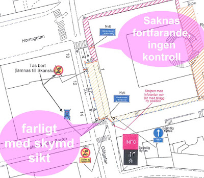Entreprenören Serneke började med att helt strunta i TA-planen. "Vi har inget med pilar att göra" svarade entreprenören när arbetsplatsen etablerades. Fortfarande är det en farlig lösning, och trafikkontoret har inte kontroll på platsen. Det är de cyklande som ansvarar för kontroll och framkomlighet utan arvode, trots att både trafikkontoret och entreprenör har det egentliga ansvaret och arvode. Medborgarna betalar för en tjänst som inte utförs rätt helt enkelt.